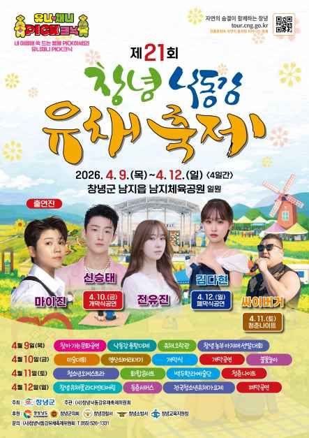 창녕낙동강유채축제는 전국 최대 규모인 110ha(약 33만 평)의 유채꽃 단지에서 열리는 창녕군의 대표적인 봄 축제입니다. 낙동강의 아름다운 경관과 어우러진 유채꽃밭은 한 폭의 그림 같은 풍경을 선사하며, 2006년부터 시작되어 관광객과 지역민이 함께 즐기는 화합의 장으로 자리매김했습니다. 2026년 4월 9일부터 4월 12일까지 창녕군 남지읍 남지체육공원 일원에서 개최되며, 개막식 공연, 지역 문화공연, 유채꽃라디엔티어링, 전시 및 체험 행사 등 다채로운 프로그램이 방문객들에게 풍성한 볼거리와 즐길 거리를 제공합니다. 자세한 내용은 홈페이지 www.cng.go.kr 또는 전화 055-530-1521로 문의하십시오.
